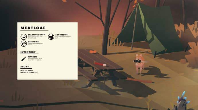 Structurally, you could say Overland is something of a roguelite. It's not just the levels that change every time you enter a new game (or continue one), it's also the characters you play as and meet. At the start of each new game, you drive into a relatively unthreatening area (most of the time), rescue a person or a dog, and recruit them to your party. Every human or dog has a random name and a unique character trait, like a mechanic who can repair cars without expelling energy, or a dog who likes to bark a lot. Some traits I found were more useful than others—shouts out to my boy Reid with the bonus energy bar—while others had traits that left me groaning a little. Once I even ended up with two party members who were both bad at driving, meaning they both used more fuel whenever they were in the car. It led to expected disaster.