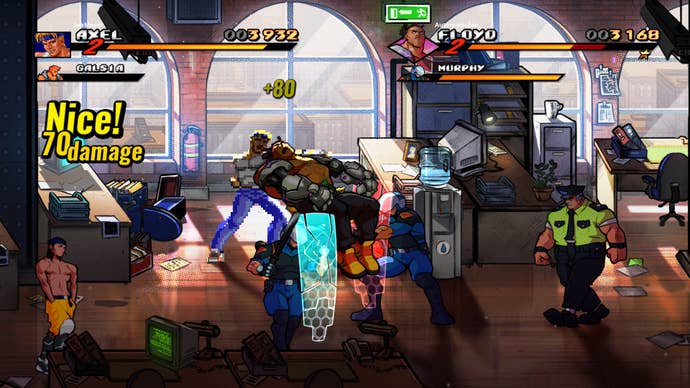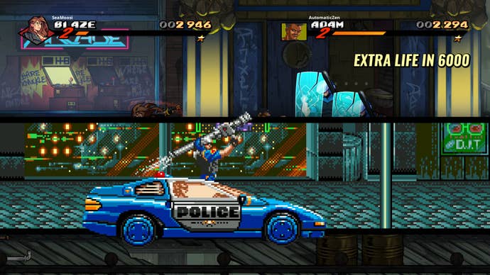 The character roster is bolstered by the inclusion of unlockable "retro" fighters, which are essentially the original lineups of old Streets of Rage games, including brawlers like Shiva and Skate Hunter. They all play like their respective games and even have moves reminiscent of their original appearances, like calling in a cop car to launch a mortar at enemies.