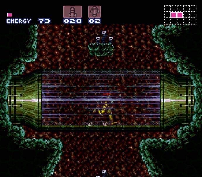 Castlevania had never reprised the first game quite so dramatically as we saw in Super Metroid's take on the corridors of its NES predecessor, though. After a brief introduction that brilliantly takes Samus Aran — and players — through the devastated bio lab seen on the title screen (minus a key difference: The baby metroid has gone missing by the time you reach the space colony), you arrive on Zebes. What you initially find is simply the ruins left in the wake of your first mission to the planet. You infiltrate the remains of the old pirate base through the tall vertical shaft through which you escaped the time bomb activated after you defeated Mother Brain, pass through the rubble of the Mother Brain's lair itself, and make your way to the iconic platform where the very first Metroid quest kicked off.