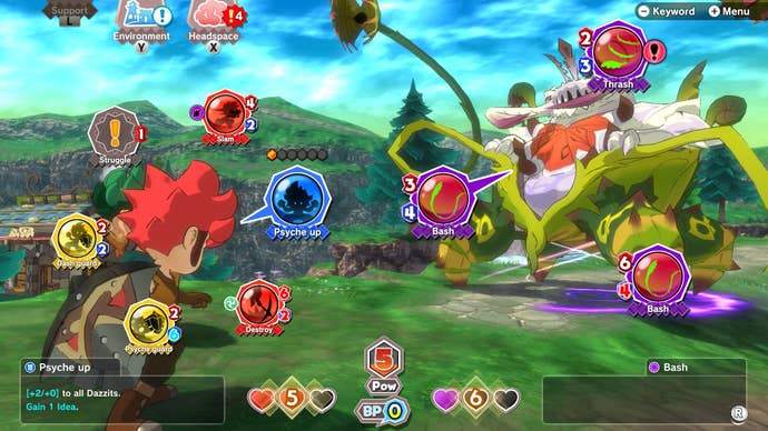 While built on a fascinating concept, the combat feels like it's been overdesigned. It's part deck builder, part board game (think like a Mario Party layout). It's a battle system that seems like it was conceived in a child's imagination, at once adorable and ludicrous. You have the cutely named "Izzits," ideas for moves that haven't materialized yet, and "Dazzits," what they turn into when you activate an Izzit. Activating an Izzit costs a certain amount of stones, and at the start of every match, you have just three of 'em. After three turns, that number goes up to four, until it eventually caps out at six action points you can spend per turn on your Izzits. Your cards are split into three categories; red is attack, yellow is defense, and blue is some sweeping perk, whether it boosts all your cards or attacks the enemy's.