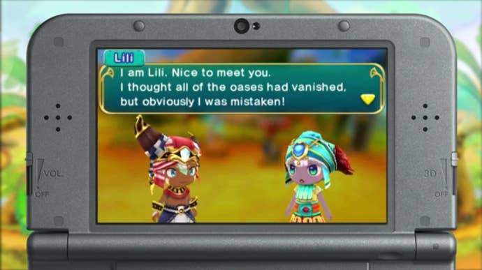 Party members likewise bring unique skills with them into battle. They are strong or weak against various monsters, and some have special abilities that can be activated to temporarily incapacitate a foe. The protagonist, who is always with the party, has a special whirlwind ability, which can be used to knock down flyers or lower the defense of sand-based enemies. All of these elements help to keep you on your toes, which in turn keeps Ever Oasis from becoming too repetitive—a common action RPG failing.