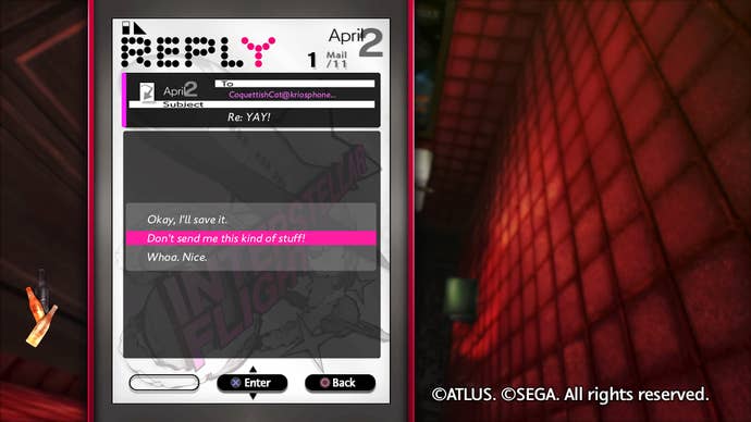 The romances with any of the characters progress in much the same way as it did in the original, with a helpful good or bad meter depending on your dialogue and text choices. Rin's the trickiest to romance of the three, so much so that even though I purposefully flirted with Rin over text to see the new route, I had to play through Catherine a second time to see that romance through as my first journey pivoted toward Katherine. (The second time I skipped the puzzles, which you can do after clearing, to focus on the other story direction.) Like the base game, there are many different levels of endings. Full Body features new endings for both Catherine and Katherine—the latter of which I saw in one of my playthroughs is a real treat.