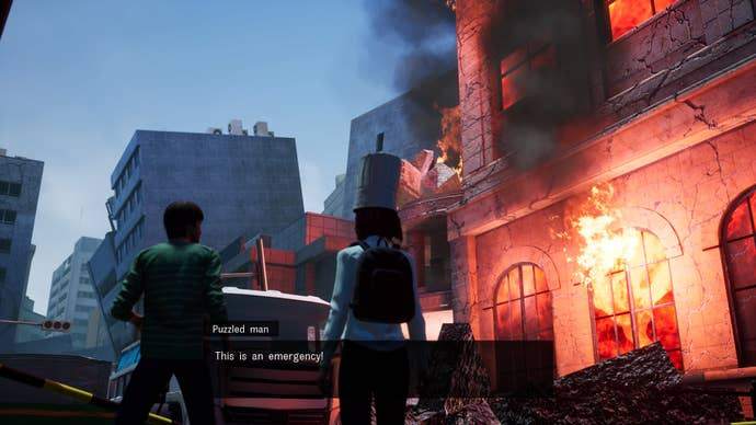 It still retains moments of levity, from the collectable compasses to the plentiful clothes, such as my favorite full cowboy get-up. (Yee-haw!) There are enjoyable moments of comedy that don't detract from the more serious story beats, like an extended subplot that culminates in a man asking what I wanted in return for doing this favor for him, and I got the option to literally change the name of the game. I decided to change it to Disaster Report 5, and my save file and loading screens from that point onward had an orange "Disaster Report 5: ?" logo.