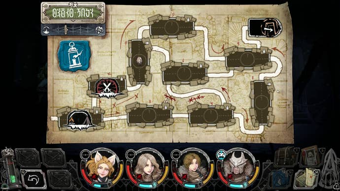 Unfortunately, it's a dungeon diver, meaning the gameplay needs to mechanically be up to snuff, and Vambrace: Cold Soul isn't quite there. The core loop involves you striking out from Dalearch into other regions of the city. Each region has various sectors that you can navigate with your handy map. Each room in a sector has a single encounter, whether that's a fight with an enemy, a treasure room, or a camp where you can rest. You can take more straight-forward routes through these sub-zones, or wander a bit for more loot and treasure. There's a soft timer though: a Geistometer slowly counts upwards in Terror as you explore, and once it's full, powerful Mad Shades will attack you constantly.