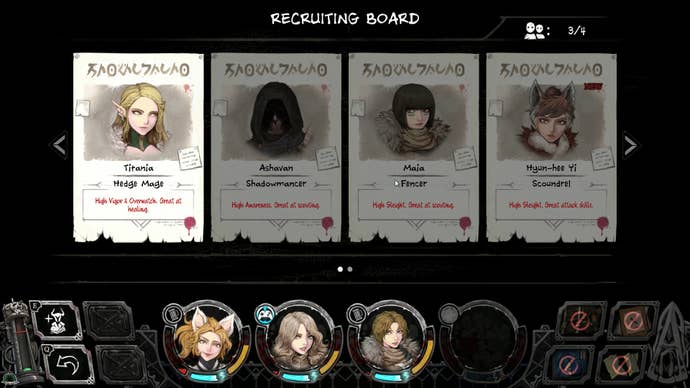 The Hedge Mage is one of the few classes that can heal in combat, and if you don't pull one, you're out of luck. There's no stable of adventurers in Vambrace; you only have Lyric, the three adventurers currently in your party, and whichever ones are available at the Hunter's Camp. And those won't change until you recruit one of them. Given how integral party composition is, you'll find that you can end up with some horrible pulls. For example, adventurers have specific attack ranges-Short, Medium, and Long-and it's possible to end up with a team where you'll have a Medium-ranged character in your third slot, meaning you're unable to attack. "Just pick the character with long range attacks for that slot!" you say. That's an apt plan, except you can't see the stats or attacks of a character until you've added them to your party. So you have to hope they're what you need, sight unseen, outside of their class.