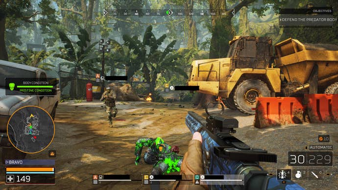 The missions all have multiple phases and various waypoints to jog to. The fireteam has a few possible win-states: to successfully escape the Predator in calling a helicopter ("get to the 'chopper," duh) after completing the main objectives; killing the Predator and successfully solving a timed puzzle to deactivate their self-destruct in the 15-second time limit, or killing the Predator and just running away from the blast radius. Two of the three are easy, with deactivating Predator's self-destruct being the most tense of the trio, which results in the team defending the creature's body from NPCs after defusing its self-destruct. The Predator, meanwhile, has just one objective: to kill their prey.